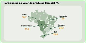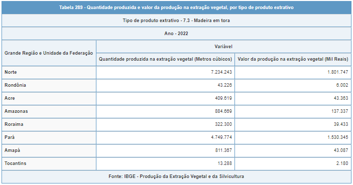A região Norte, como um todo, obteve bons resultados com os mesmos produtos. Produziu 7.234.243 m3 de madeira em tora, gerando R$ 1,8 bilhão; com um quantitativo de 3.544.425 m3 de lenha, alcançou um valor de produção de R$ 92 milhões.