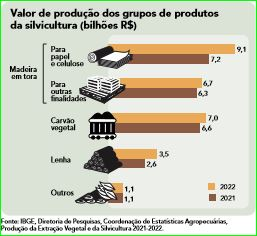 O carvão vegetal foi o segundo produto com alto valor de produção na silvicultura, alcançando 6,7 bilhões em 2022. A quantidade produzida aumentou em 3,9%. Outros produtos que tiveram aumento na quantidade produzida foram a lenha (2,3%), a madeira em tora para papel e celulose (11,9%).