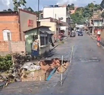 O buraco já toma conta da via e, por sua largura e profundidade, também está ameaçando a estrutura de residências que ficam nas proximidades. Condutores que precisam acessar o trecho da via comprometido precisam entrar na contramão para conseguir passar, o que pode ocasionar graves acidentes no local.