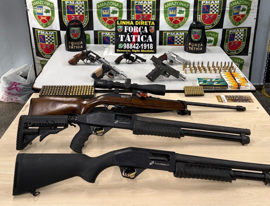 Um arsenal com oito armas de fogo e mais de 900 munições foi apreendido pela Força Tática da Polícia Militar do Amazonas (PMAM) após uma denúncia de violência doméstica no bairro Novo Aleixo, na zona norte de Manaus. A ação ocorreu na tarde desta sexta-feira (11/04).