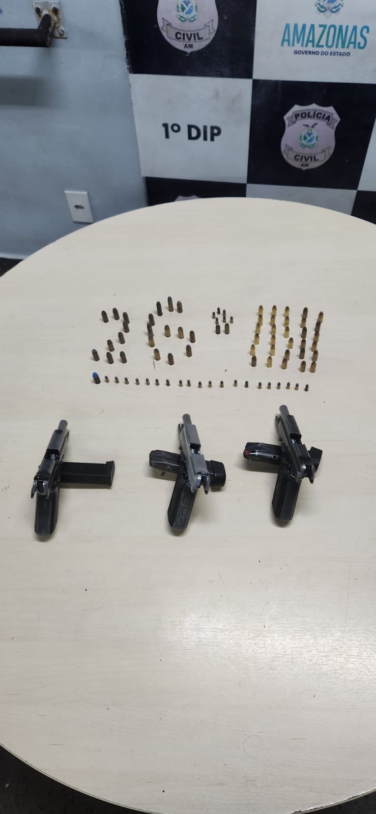 O caso foi repassado ao Setor de Inteligência (SEAI), que identificou o suspeito. De posse das informações, a guarnição se deslocou até o endereço indicado. No local, o policial foi abordado e, ao ser questionado, admitiu participação no crime. Ele apresentou três pistolas modelo PT 940, todas com o brasão da PMAM, além de munições de calibres variados.
