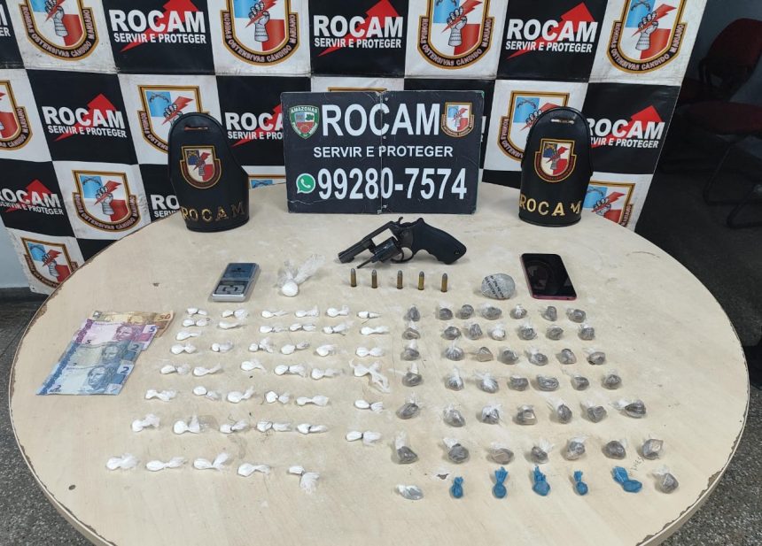 Durante a abordagem da Rocam, foi encontrada com o infrator um revólver calibre .38 da marca Taurus com a numeração suprimida, além de cinco munições intactas do mesmo calibre. O suspeito também estava com cerca de 100 porções de maconha e cocaÃna, uma balança de precisão, um celular e dinheiro em espécie.