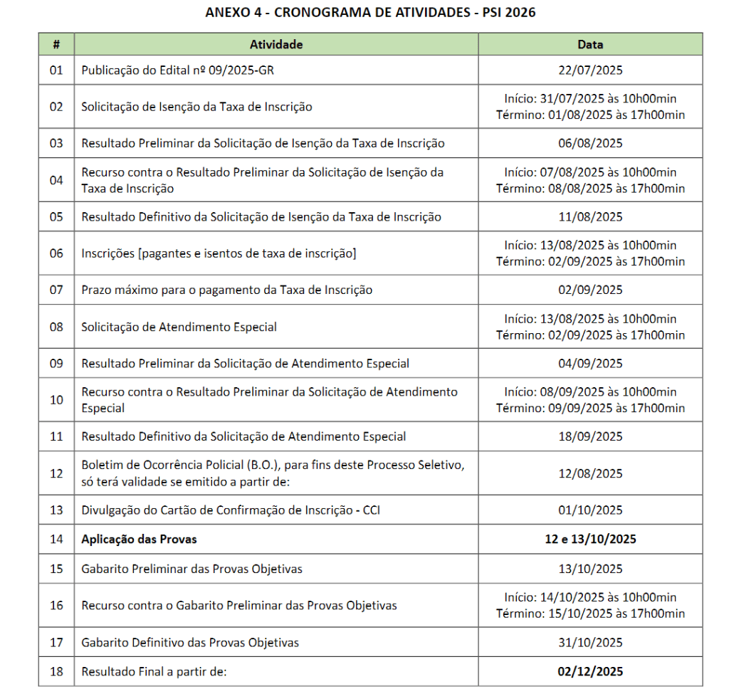 O cartão de confirmação de inscrição (CCI) estará disponível a partir de 1º de outubro. As provas do PSI acontecerão nos dias 12 e 13 de outubro de 2025, com aplicação nos seguintes municípios: Benjamin Constant, Coari, Codajás, Humaitá, Itacoatiara, Manacapuru, Manicoré, Maués, Parintins, Santo Antônio do Içá, São Gabriel da Cachoeira, São Paulo de Olivença, Tabatinga e Tefé.