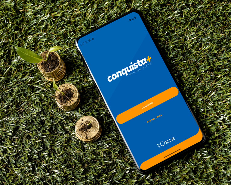- Baixe o aplicativo Conquista Mais no celular, e inicie o cadastro clicando em Criar Conta;