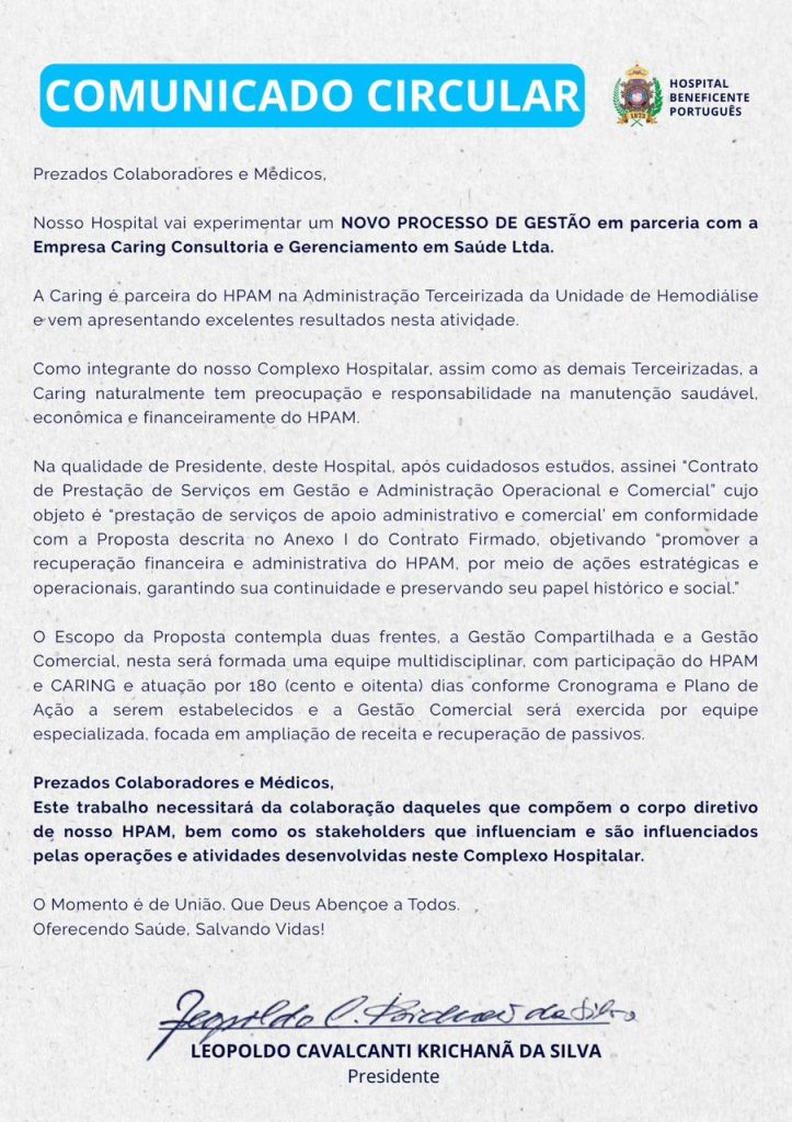 Desde 1º de maio, a gestão administrativa e comercial da unidade passou a ser realizada pela empresa Caring Consultoria e Gerenciamento em Saúde Ltda., conforme comunicado assinado pelo presidente da instituição, Leopoldo Cavalcanti Krichanã da Silva. No documento, o hospital afirma que a mudança faz parte de um novo processo de gestão voltado à recuperação financeira da instituição, com previsão de atuação conjunta entre a equipe da unidade e a nova administradora por 180 dias.