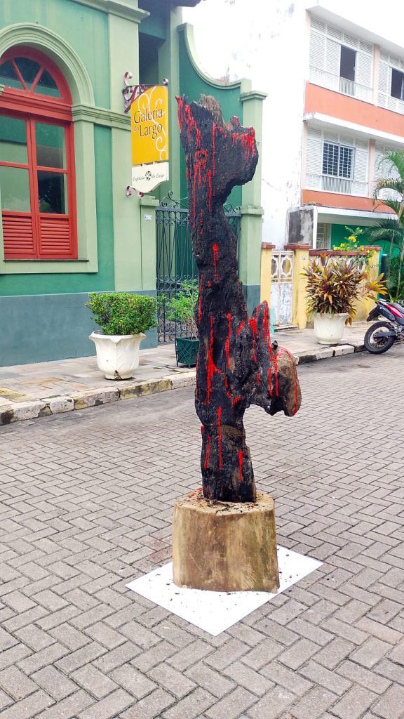 Na instalação “Desnudes”, Paulo Olivença reflete sobre a tensão entre a natureza e o avanço tecnológico. A partir de troncos e vídeos gravados na floresta, o artista constrói uma narrativa sobre a coexistência e o conflito entre o ambiente natural e a “revolução tecnológica sufocante”.