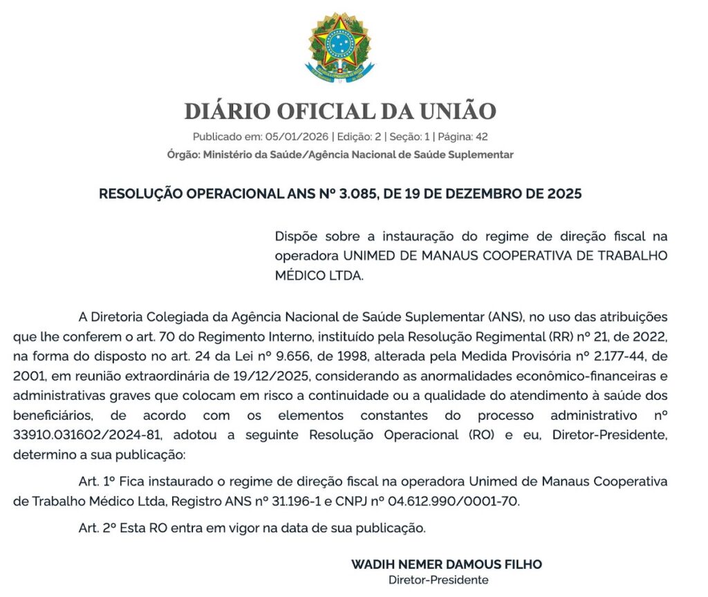 A Agência Nacional de Saúde Suplementar (ANS) instaurou regime de direção fiscal na Unimed de Manaus Cooperativa de Trabalho Médico Ltda., operadora de planos de saúde que atua no Amazonas. A medida transfere à agência reguladora o controle fiscal da operadora e tem como objetivo acompanhar e corrigir a gestão econômico-financeira e administrativa da empresa.