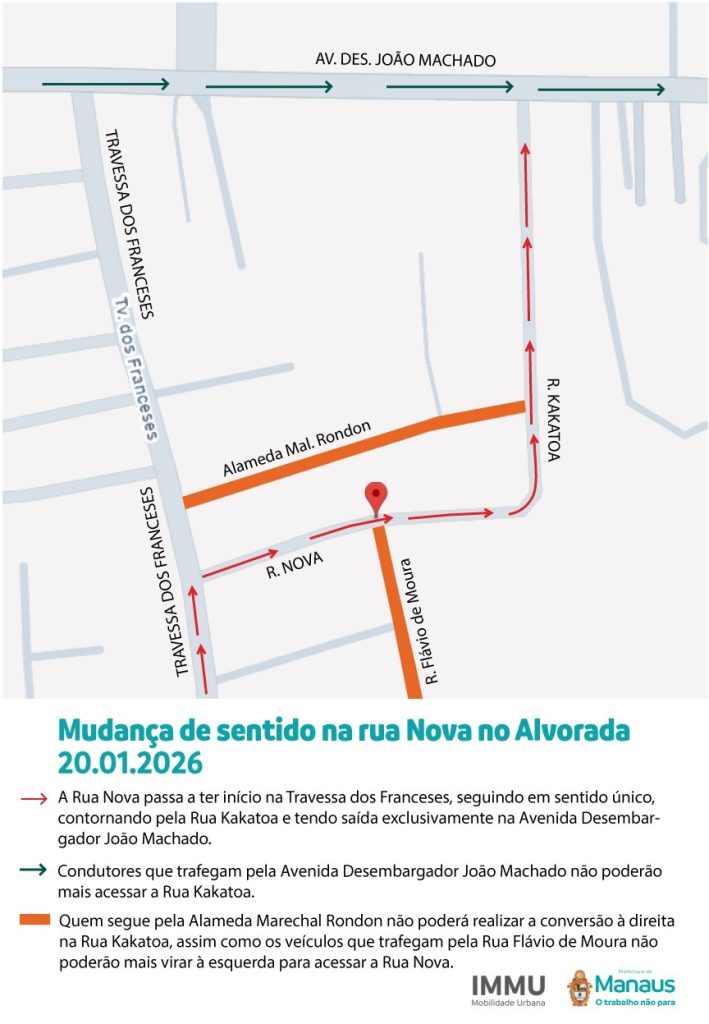 O Instituto Municipal de Mobilidade Urbana (IMMU) informou sobre mudança de sentido viário da rua Nova, localizada no bairro Alvorada, na zona centro-oeste de Manaus, que passa a valer a partir da próxima terça-feira (20/01).
