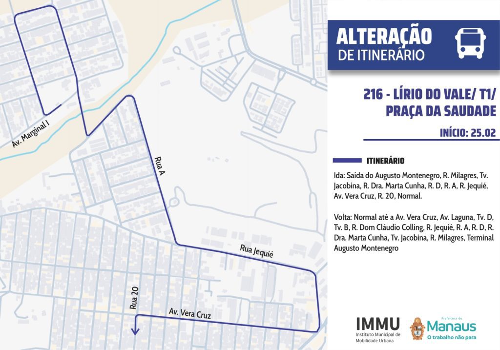 O Instituto Municipal de Mobilidade Urbana (IMMU), informa que a linha de ônibus 216 – Lírio do Vale/T1/Praça da Saudade terá alteração de itinerário a partir desta quarta-feira (25/02). A mudança faz parte do monitoramento contínuo realizado para aprimorar o atendimento do transporte coletivo e garantir maior eficiência operacional na região.
