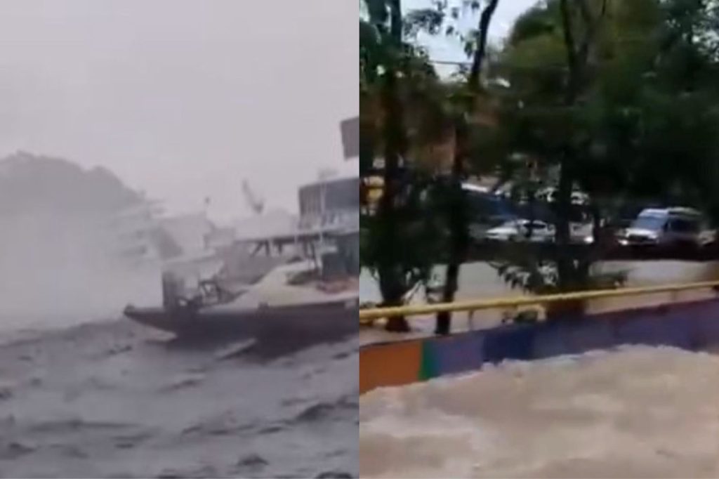 Outras duas ocorrências foram registradas na cidade, ainda durante a tarde desta quarta-feira (25), que causaram pânico aos presentes no momento. Na orla do porto do bairro São Raimundo, zona Oeste, uma tromba d’água foi registrada agitando embarcações e destruindo telhado de flutuante.