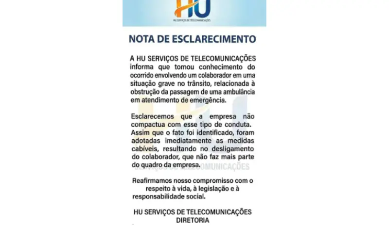Após a repercussão do caso, a empresa HU Serviços de Telecomunicações informou, por meio de nota, que tomou conhecimento dos fatos e decidiu pelo desligamento imediato do funcionário envolvido. A companhia declarou ainda que adota medidas alinhadas à legislação e às normas de responsabilidade social.