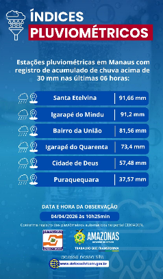 Dados da Defesa Civil do Amazonas apontam acumulados elevados em diferentes regiões da cidade. Em Santa Etelvina, o volume chegou a 91,66 mm, enquanto no Igarapé do Mindu foi de 91,2 mm.