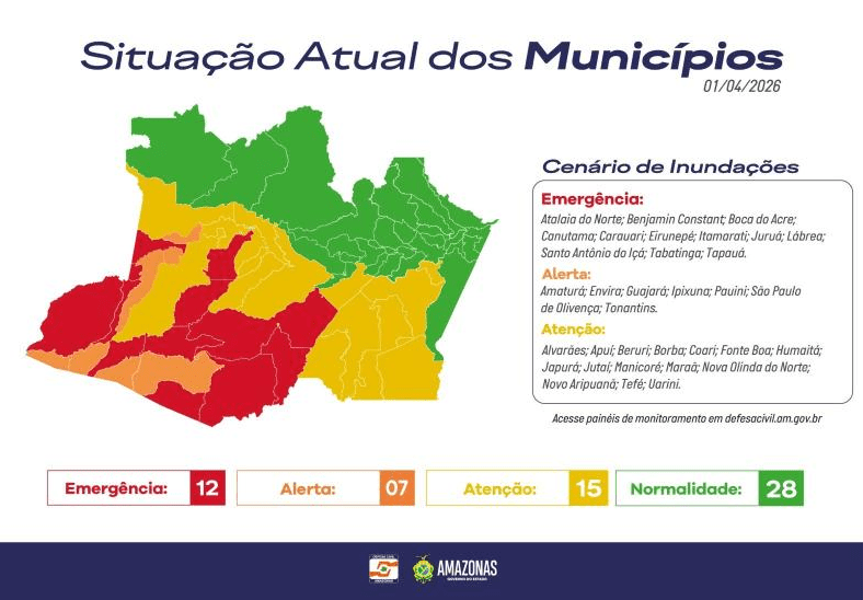 - Emergência (Vermelho): 12 municípios já enfrentam inundações graves. Entre eles estão Tabatinga, Benjamin Constant e Boca do Acre. Nestas áreas, o socorro e a assistência às famílias atingidas são prioritários.