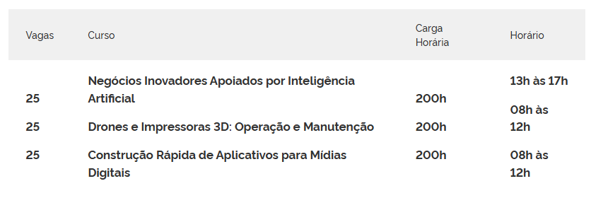 As capacitações são totalmente gratuitas e os estudantes selecionados recebem também um auxílio financeiro para custear o transporte e a alimentação. Confira a tabela abaixo: