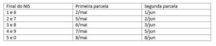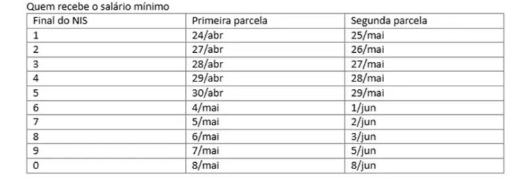 Os pagamentos serão realizados em duas parcelas, projetando mais de R$ 78 bilhões na economia do país. A primeira parcela será paga de 24 de abril a 8 de maio, enquanto a segunda parcela vai de 25 de maio a 8 de junho.