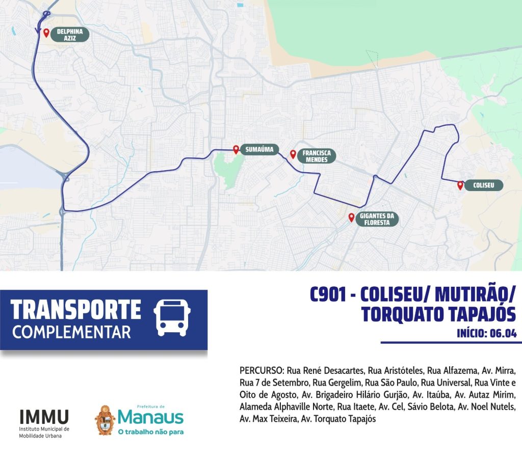 A partir desta segunda-feira (6/04), a linha de ônibus C-901 (Coliseu/Mutirão/Torquato Tapajós) entra em operação em Manaus. A nova rota liga a comunidade Coliseu, bairro Jorge Teixeira, na zona Leste, às imediações do bairro Tarumã, na zona Oeste.