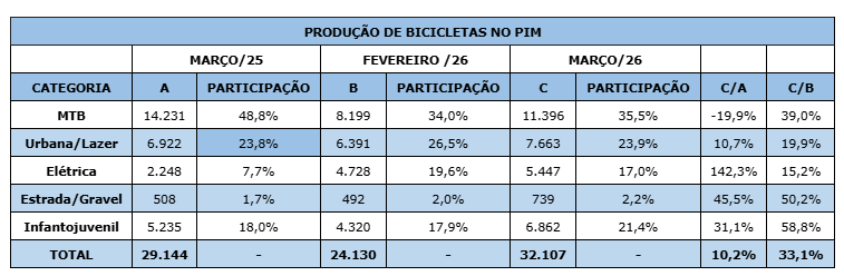 A categoria mais produzida em março foi a Mountain Bike (MTB), com 11.396 unidades e 35,5% do volume total fabricado no período.